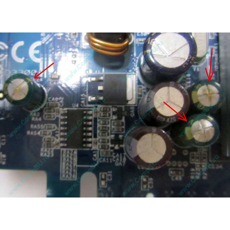 Есть дефект: нескольких слегка вздутых маленьких конденсаторов (видно на соответствующих фотографиях). При этом видеокарта проходит тест производительности в Windows 7.